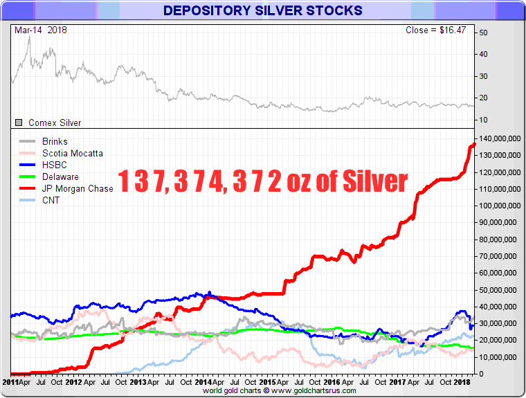One piece of information that was not included on the fundamental side of that story is the ridiculous silver hoard JP Morgan has accumulated since the silver price collapsed off its all-time high. Compare that to this year’s solar panel manufacturing and physical silver photovoltaic demand estimate at 140 million ounces, and that amounts to approximately 15% of the estimated silver production for 2018. That is slightly more than JP Morgan’s current hoard at the COMEX.