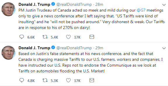Trump refuses to back G-7 declaration, calls Trudeau ‘weak’ and threatens car tariffs – CNBC, Jun. 9