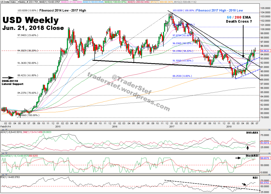Is the Dead Cat Bounce dead or alive? Pros: As noted in my analysis from late April, a breach above the 50 EMA did occur in May, and continued with strength last week due to the EUR plunge and trading war headlines with China. Price is now trading above all the moving averages. StochRSI has risen as high as it can go and could hang out up there for a while. Cons: Price has reached into a confluence zone of four separate Fibonacci levels with significant resistance between $94 and $96. The high so far this week is $95.52. RSI has not yet breached above the trendline drawn down from early 2015. DMI-ADX is indecisive.