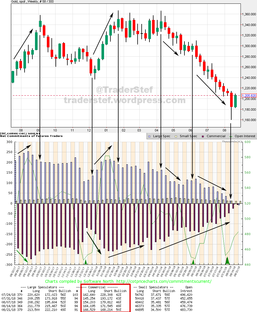 Here is the most recent CoT and Open Interest (OI) data as of Aug. 21, as reported on Aug. 24, overlaid with the gold spot weekly chart as of the Aug. 24 close. Note the net position pattern of highs and lows, and total OI is the fine green line with its lows marked by arrows at the base vs. gold price trends. The return to an uptrend in gold is well overdue in extremely oversold, lopsided conditions. There is too much focus in the financial press about the large spec short positions, while ignoring what the commercials are doing. Gold rallied $48 last week, and all I heard were crickets in the arena.