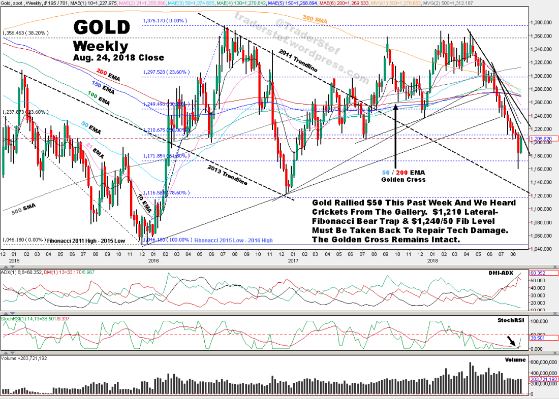 Gold printed a low of $1,160.27 the prior week, then a high of $1,208.52 and a close at $1,205.82 this past week. Serious technical damage did occur, with a break of the lower trendline drawn up from 2015, but the Golden Cross remains in play on the weekly, with a $5 spread before any potential Death Cross, and the chart is still printing higher lows since Dec. 2015. The POTUS appeared again, as I suspected on Aug. 20 that he would chime in soon to slam the Fed a bit more about interest rate hikes and a strengthening dollar. Last week’s candle came close to a Bullish Outside Reversal with the $48 run, but not quite enough. This week should clarify if the current pivot is a dead cat bounce or a breakout of a Bear Trap pattern back above the $1,210 Fibonacci lateral. There are multiple pivot points along $1,210 going back to 2015, and the CoT is surely primed for a major short squeeze. The DMI-ADX is at its peak, and the StochRSI has broken back into a near-term bullish indicator. I remain bullish long-term, and odds are leaning to at least a decent bounce near-term as the seasonal low pattern was past due and the world is looking dicier on every level as each day passes.