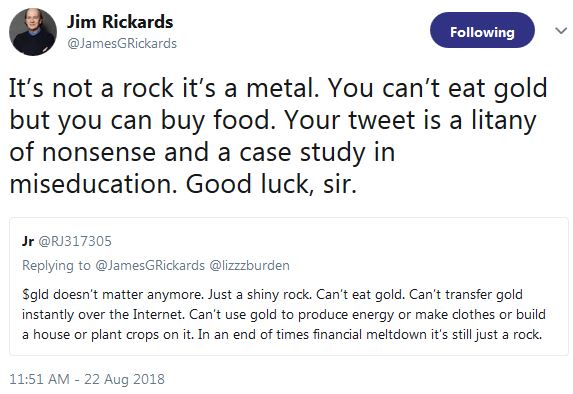 The Time is Now – Jim Sinclair & Bill Holter – The World Is Venezuela… “Renowned gold and financial expert Jim Sinclair and financial writer Bill Holter get ready for the reset in the price of everything including gold and silver. Sinclair also says, ‘It’s going to be a Friday to Monday event. There is going to be an explosion, and the explosion is a change. It may blow your mind, but the explosion would not be three or four months or a year in upticks in these items (gold and silver prices). Oh, they are going to uptick. That is for sure. The finality of this is going to be the reset… Thank God you know this now and do the necessary. Gold will be the last man standing. After June of 2019, there will be an entire new system monetarily only known to the early advocates of the theory of ‘Free Gold.’” – Jim Sinclair, Aug. 20/Aug. 25 Video Interview