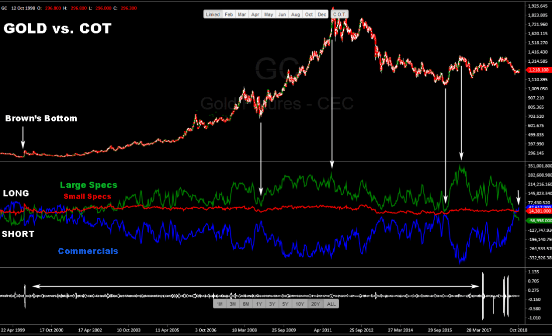 The annotations and arrows on the above chart emphasize Brown’s Bottom in relation to the commercials going net long late in the decade. A few other low and high points are arrowed that were not net short or net long extremes, and they emphasize that the commercials are always on the opposite side of the trade for the reasons noted above so eloquently by Trader Dan. The commercials have been accumulating long positions since early summer and are now in net long territory not seen since just prior to 9/11, with the large specs in way over their heads in short positions. The line on the bottom is a study few may recognize or know of, and I have chosen not to identify it at this time but included it to drive home an additional visual with the commercials going net long at the turn of the century vs. now. Gold has advanced $72 since its low in August, 2018.