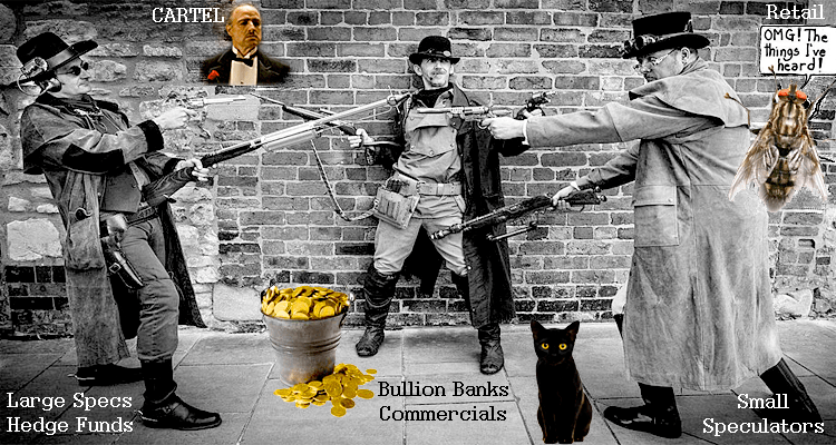 ‘It really is quite simple but critical to understand this – bullion bank (commercials are smart money in this wash and rinse scenario) selling caps gold to the upside as they attempt to eat through the plethora of bids in a rising market. They cannot hold back the rise (momo play) in gold but they attempt to contain it. Once upside momentum begins to wane, the technical’s turn and then the hedge fund (large speculators) money begins exiting as longs are liquidating. It is into this long liquidation that the bullion banks do their short covering as they lift the shorts by buying them back. However, and this is the big key to understanding gold, the biggest physical buyers of gold on the planet (including the Eastern Central Banks) who only buy when they believe gold is now ‘cheap,’ step in and actually compete with the bullion bank buying. That forces these perma bears to rapidly cover shorts at a much faster clip than they would prefer. After all, if the speculative (large and small spec) crowd is in the process of throwing away their gold (particularly after a algorithmic or cartel arranged mini-puke at a key technical level), why get in the way? Let them throw away as much as they can and the bullion banks can leisurely continue their short covering letting the market sink lower and lower as they profit all the way down. The problem that they have is the huge physical market in gold prevents them from having the luxury of sitting on their hands while the market drops lower (sometimes nearing the miners’ average cost of production per ounce). Therefore, they are forced to buy back at a much faster clip. That is what drops the open interest down to near the same levels as the last upleg began but leaves the price at a much higher level than the initial breakout run.’ – Trader Dan Norcini –Just the Facts, Feb. 2010”