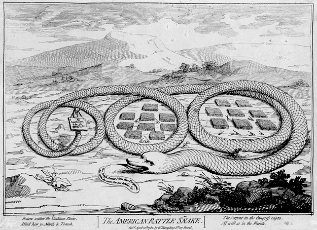 When America defeated the British and a peace treaty was negotiated in 1782, English cartoonists depicted the patriot colonists as “The American Rattlesnake.”