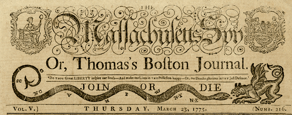 A common superstition back in the day is that a snake cut into pieces might come back to life if its pieces are put back together before sunset. “JOIN, or DIE” initially had nothing to do with independence from Britain, but rather a call for unity to defend the colonies during the French and Indian War. Newspapers throughout the colonies reprinted Franklin’s political cartoon, and the Boston Gazette added the words “Unite and Conquer” flowing from the mouth of the rattlesnake. The rattlesnake became a symbol of unity and eventually appeared in art, banners, uniform buttons, caricatures, flags, newspapers, paper money, political cartoons, and a multitude of paraphernalia. Here is a newspaper header from the Massachusetts Sun: