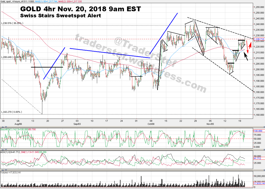 The following chart was posted exclusively for my website subscribers on Nov. 20, with a note to “keep a close eye on the price action of gold for a potential sweet spot entry” due to a confluence of indicators. Note the Swiss Stair pattern pointed out by the black arrow.