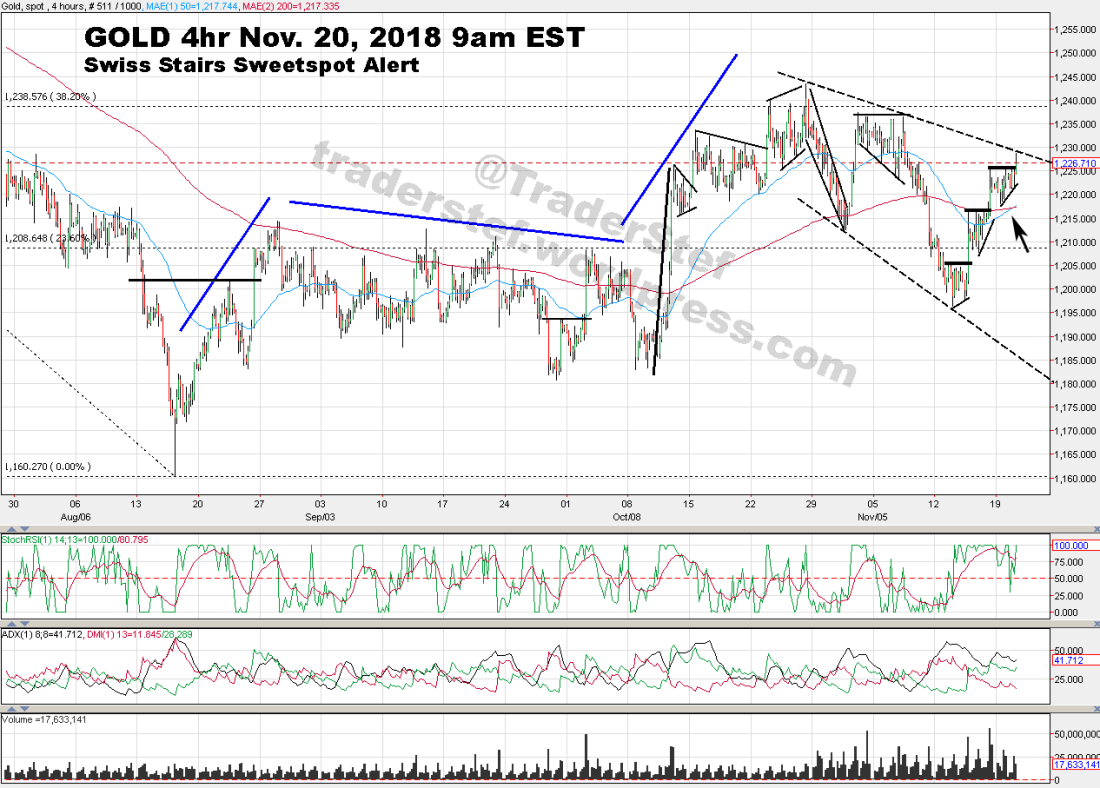 “Keep a close eye on the price action of gold at the current confluence of indicators. A Swiss Stair pattern is building, the 50 EMA is set to cross back over the 200 EMA for a continuation of a Golden Cross, and the dashed topside trendline is being challenged this morning. A potential sweetspot entry lurks just ahead.”