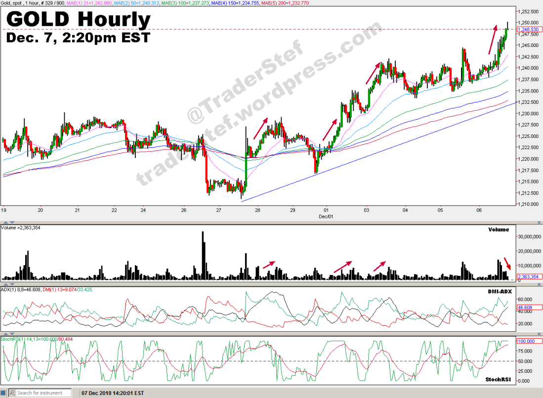 As of 2:20pm EST today (Friday, Dec. 7), price has reached a level of substantial resistance in the low $1,250s. Note the hourly chart below. The StochRSI and DMI-ADX remain bullish but volumes are falling as price is rising today, and that divergence may indicate a correction is near.