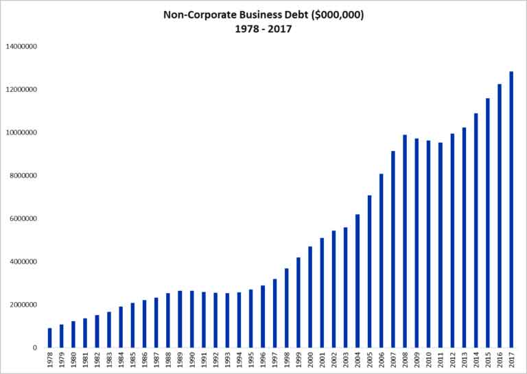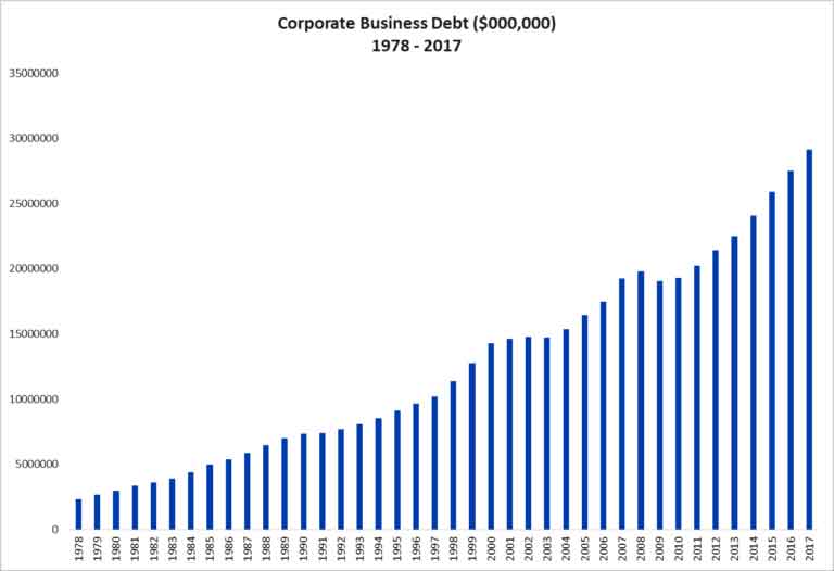 If those charts on corporate debt and leverage are not clear, try the following for a basic overview. Corporate and non-corporate business debt in trillions from 1978 to 2017.