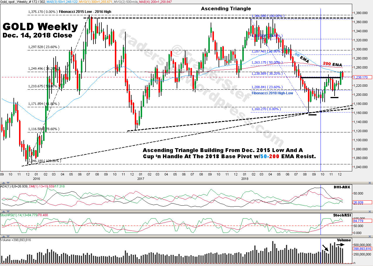 The weekly chart tells another story and may clarify. Following the price swoon for most of 2018, a well-defined Cup ‘n Handle pattern developed following a pivot off the 2015 lower trendline, which was noted in a Dec. 5 Tweet, as well as the Dec. 7 sweet spot update alert. Throughout the Cup ‘n Handle, volumes fell along with price and then rose or remained steady during a price rise. The Cup ‘n Handle rim line is tied to the hip with the $1,238 Fibonacci level taken out on Dec. 7, leading to the high of $1,251, but the next Fibonacci at $1,249 and the overhead 50 EMA acted as resistance and the price retraced to a $1,233 low on Friday morning. If the 50 & 200 EMAs are taken out with rising volume, the odds favor a sooner retest of $1,300.