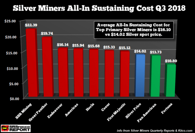 The current all-in cost of production (AISC) per ounce for the top silver miners is around $16.50 on average. The following AISC for the major silver miners is courtesy of SRSrocco Report, and the estimated distribution of all mined silver data is courtesy of GoldSilver.