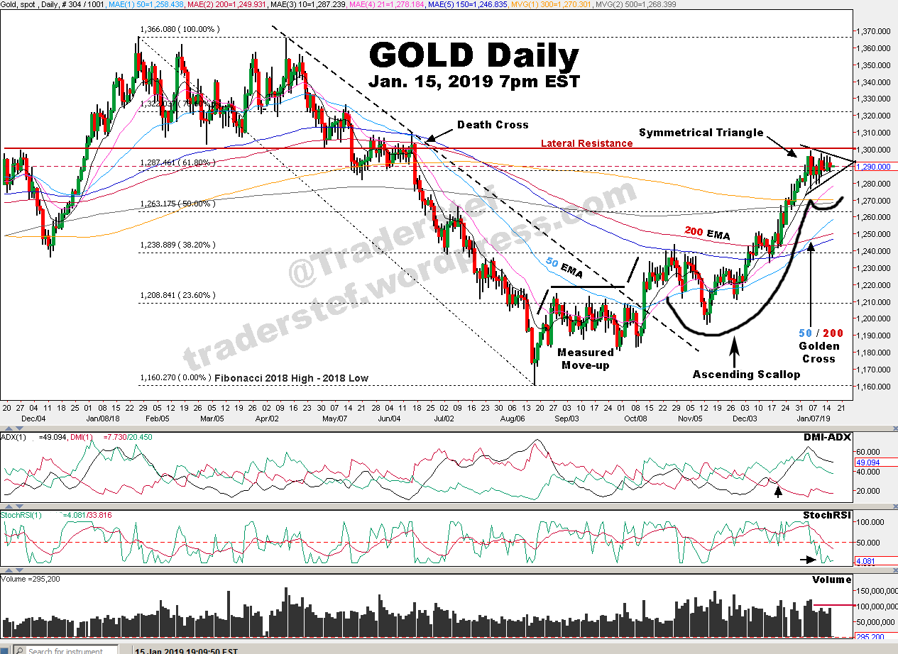 “Gold Daily Chart Jan. 18, 2019 1:30pm COMEX Close… Uptrend, Golden Cross, and Symmetrical Triangle remain intact, triangle now as a wider spread due to price action today.” – Real-time update on Twitter
