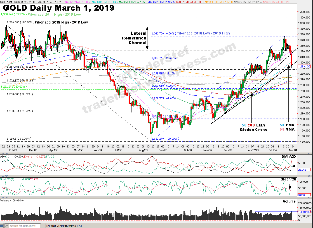 As suspected, following the stellar $200 upside run with three sweet spot opportunities to trade since Aug. 2018, a healthy correction is in the process of finding a base. The 21 EMA was breached to the downside on Feb. 28, and a lower trendline provided initial support. On Mar. 1, that trendline was breached as automated stop-loss positions were triggered and the price found support around the 50 EMA and SMA, a secondary lower trendline, and the $1,287 Fibonacci level that slices through the lateral price chop that occurred through Jan. 2019. The DMI-ADX has flipped to a negative stance, and the StochRSI plunged to an oversold condition on Mar. 1. The volumes were rising as the price fell during the last three trading sessions, and they have reached a peak or are fuel for further downside price action. The next support level is at the 100 EMA and $1,275 Fibonacci. The overhead 50 EMA must be taken out with conviction for an upside pivot to have any legs, otherwise the price will probe the next support level and/or chop sideways. March generally leans to the downside before chopping sideways when considering the seasonality pattern. I remain bullish long-term but revert to a neutral stance until the uptrend reasserts itself above the 50 EMA and $1,300 with conviction.