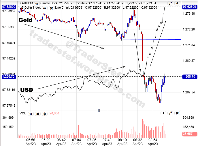 Gold vs. USD 1-minute chart Apr. 23, 2019…