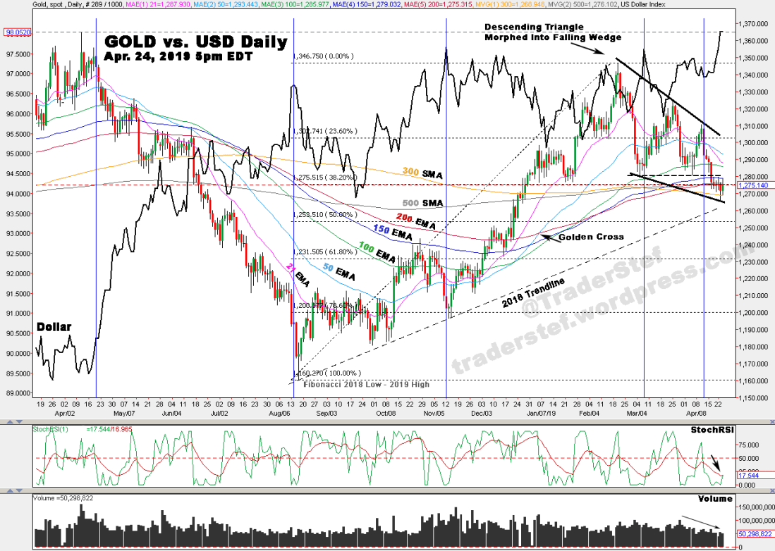 Gold vs. USD daily chart as of Apr. 24, 2019 at 5pm EDT…