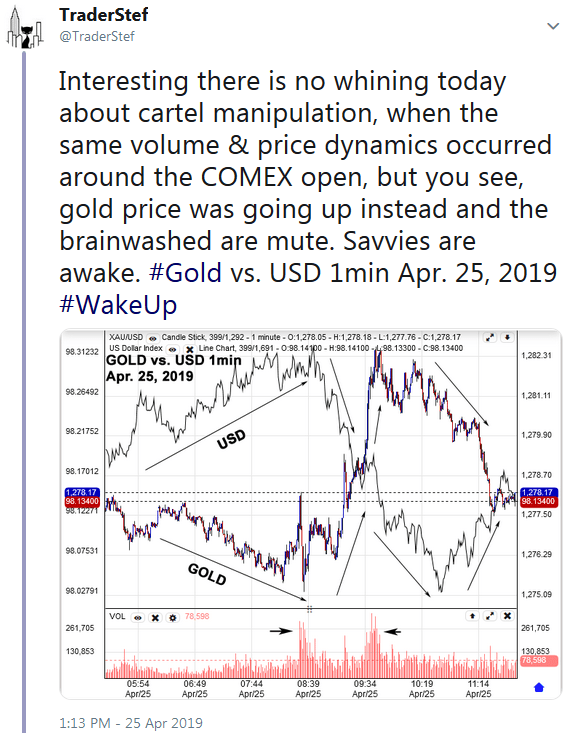 Gold vs. USD 1-minute chart Apr. 26, 2019 1pm EDT…
