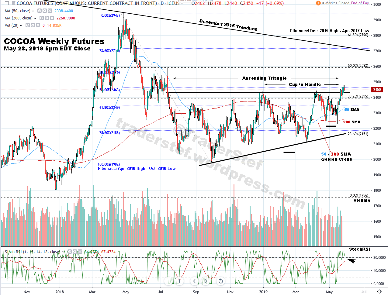 Cocoa futures weekly chart, May 28, 2019 as of 5pm EDT…