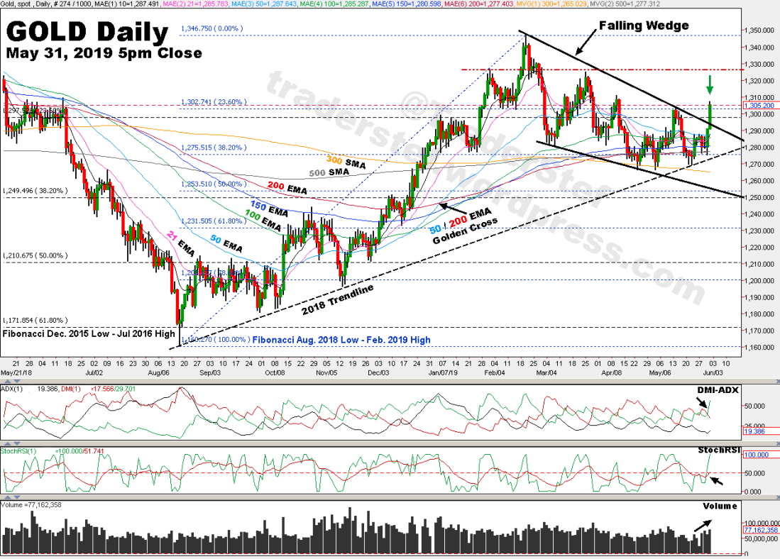 A bullish Falling Wedge formed since the Feb. high and its topside trendline was breached this morning with a bullish Long Day candlestick in response to tariffs imposed upon Mexico. Note that the lower trendline drawn up from the Aug. 2018 low was never violated, the 100 and 150 SMA provided support over the last two months, and the 50/200 SMA Golden Cross has remained intact since early 2017. All of the moving averages except for the overhead 500 SMA are realigning back under the price action. The DMI-ADX remains in a positive stance and is beginning to reassert a bullish momentum. The StochRSI has returned to positive momentum with a pivot out of oversold territory.