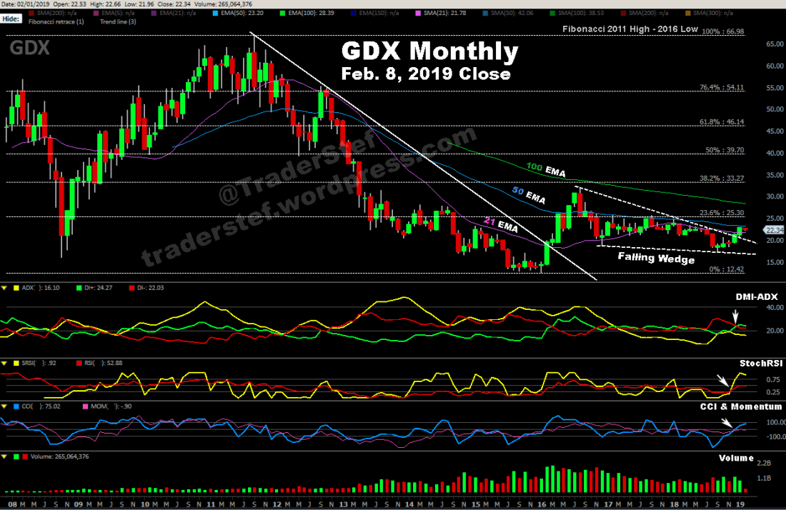 “After GDX reached a high of $66.98 in Sep. 2011, the price plunged 88%+ over a 4 1/4-year period to end with a $12.40 low in Jan. 2016. The price pivoted to a high of $31.79 by Aug. 2016, then formed a Falling Wedge until its topside trendline was breached in Jan. 2019. The Dec. 2018 monthly buy volume reversed the StochRSI into a positive trend as the price began to exit the Falling Wedge and made a final push upwards in January. The DMI-ADX also reversed to a positive stance vs. negative, but it remains indecisive. The overhead 21 Exponential Moving Average (EMA) and Simple Moving Average (SMA) were taken out with hesitation and the 50 SMA at $23.20 is now resistance. The buy volume will need to come back to life for the price to breach the 50 SMA and rally to the 23.6% Fibonacci at $25.30, which is where previous attempts have failed over the last 2 years.”