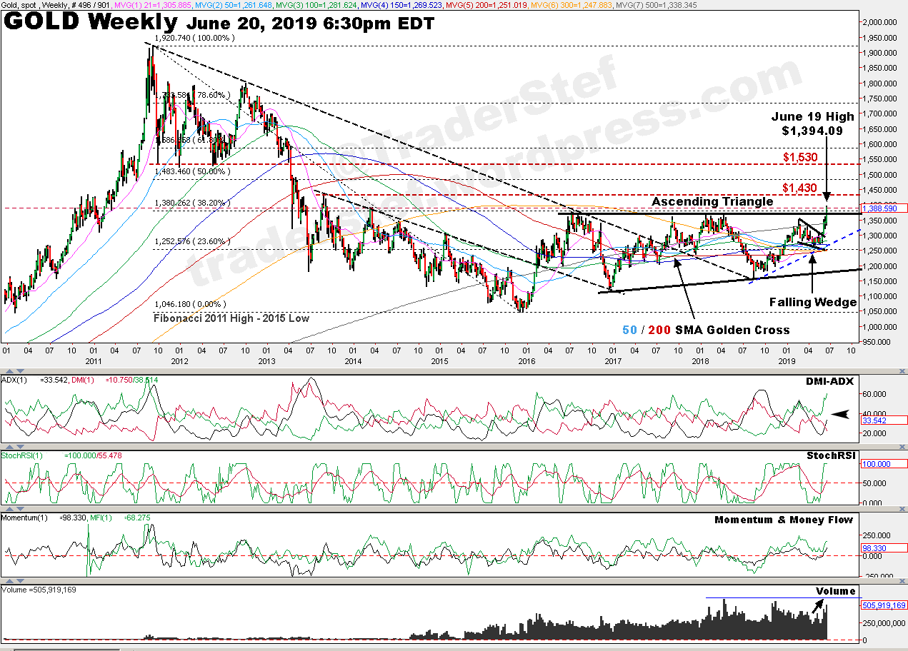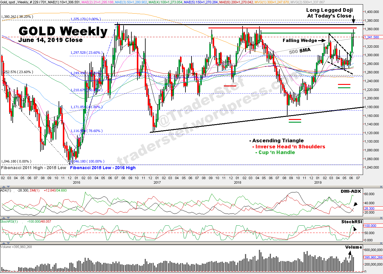 Gold weekly chart as of Jun. 20, 2019 6:30pm EDT…