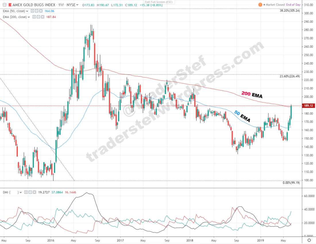 Not delineated on the weekly chart is Friday’s $10 gap-up in price, which launched the price out of the Cup ‘n Handle pattern. How far the price printed above the 200 moving average depends on whether you are looking at the EMA or SMA. Note how the EMA clearly acted as an overhead resistance area since late 2016, but the SMA made a beeline through the middle of the oscillating price chop. That is a perfect example of why I prefer the EMA even when analyzing charts beyond the daily period. No matter which chart you look at, the 50 EMA is history and the Alligator Tongue is setting up for a bullish run if the ADX (black line, a.k.a. the tongue) spikes to the upside. The HUI appears primed for a $40 run up to the 23.6% Fibonacci level.