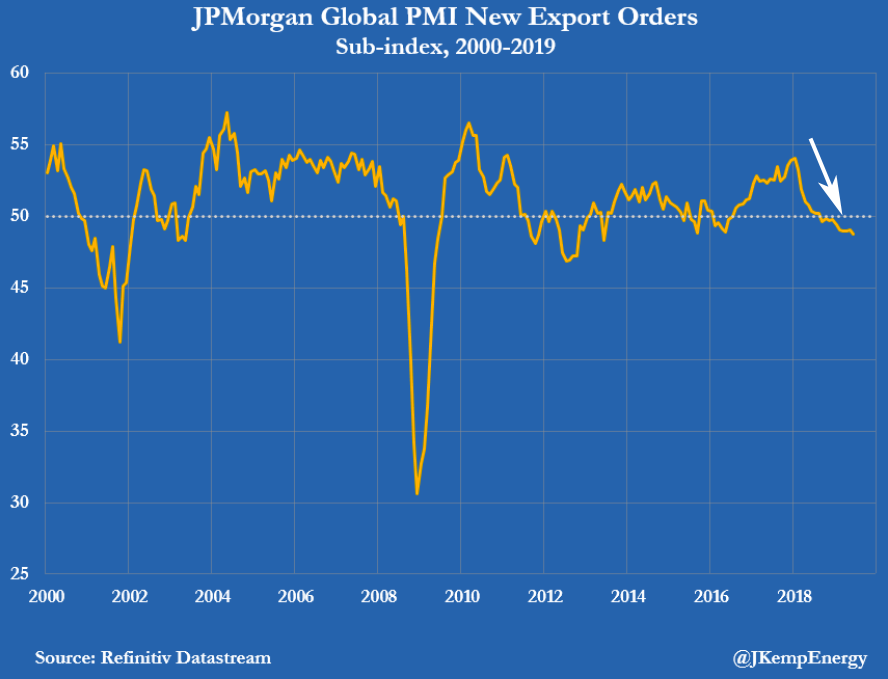 The world is currently experiencing an economic slowdown, and that fact lessens the demand for silver and contributes to a low or stagnant price range. Global trade has plunged over the last two years and manufacturing and construction have already entered a downturn. A plunge in the service sector is one of the last dominoes left to fall and could lead to a full-blown global recession. Global manufacturers reported that new export orders fell for a tenth month in June and are the most widespread decline in six years. The U.S. has weathered the global slowdown relatively unscathed, with the exception of our sovereign debt level, but growth in manufacturing and construction are beginning to stall. Overall, global growth is probably too weak at this point to absorb any major shocks without plunging the world into a more serious downturn.