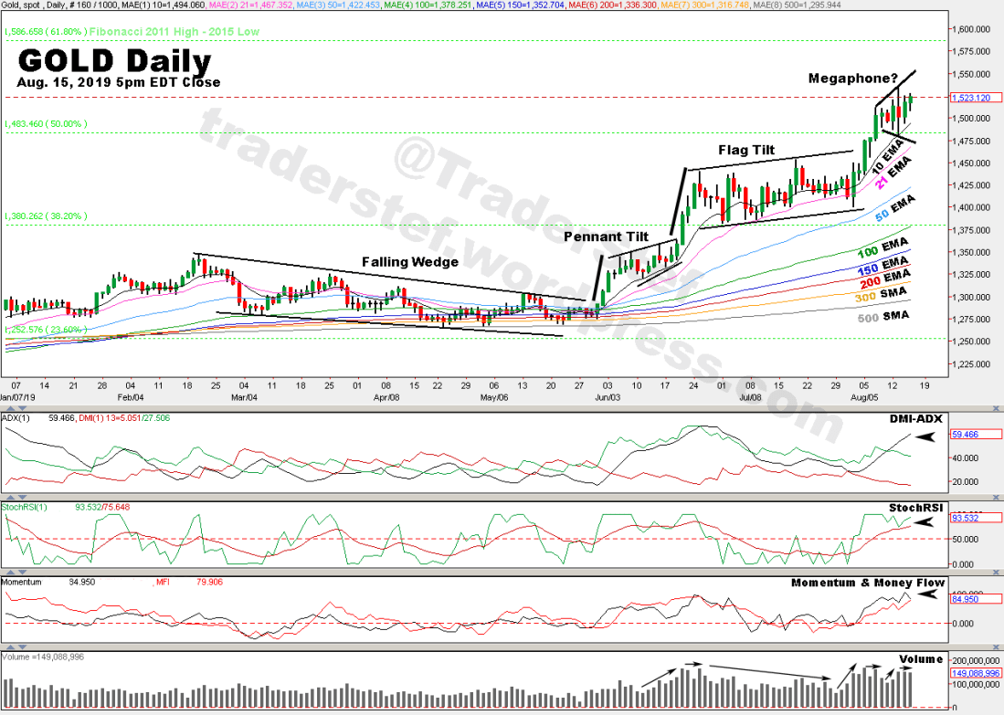 UPDATE: Gold daily chart Aug. 19, 2019 10:30am on Megaphone potentials…
