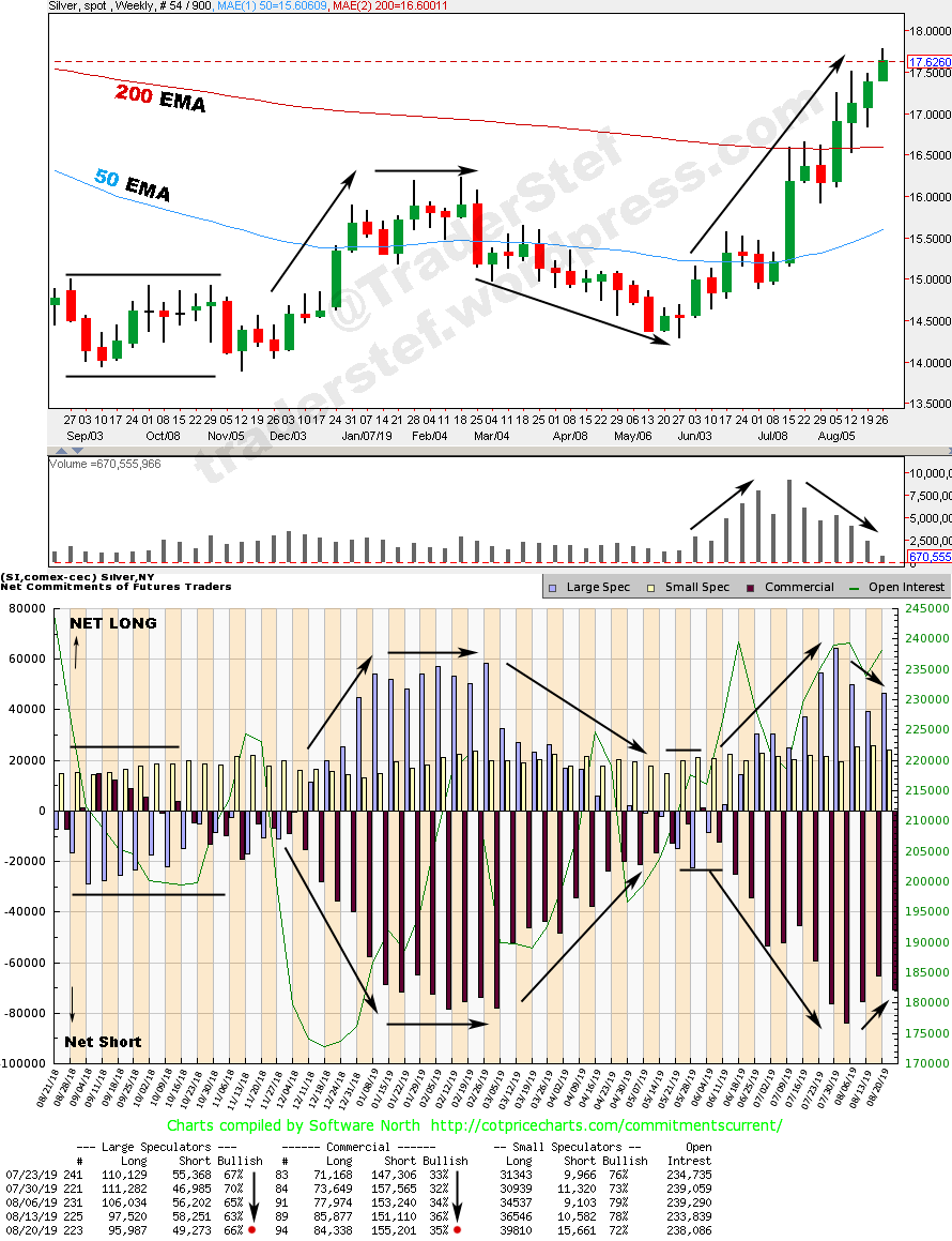 The purpose of the overlay is to help identify the near-term price trend based on positioning by the commercials (bullion banks) and large specs (hedge funds). Almost without exception, the commercial (bullion banks) traders build short positions during a rising price trend and large specs (hedge funds) add long positions to capture the momo play. When the price is approaching an inflection point, their positioning begins to flip. It appears that silver is very close to a shift in price where it can take a breather and consolidate until another leg up. Zoom in to the bottom of the chart and note the Aug. 20 data points marked with red dots. I included the 50 & 200 Exponential Moving Averages (EMA) for reference.