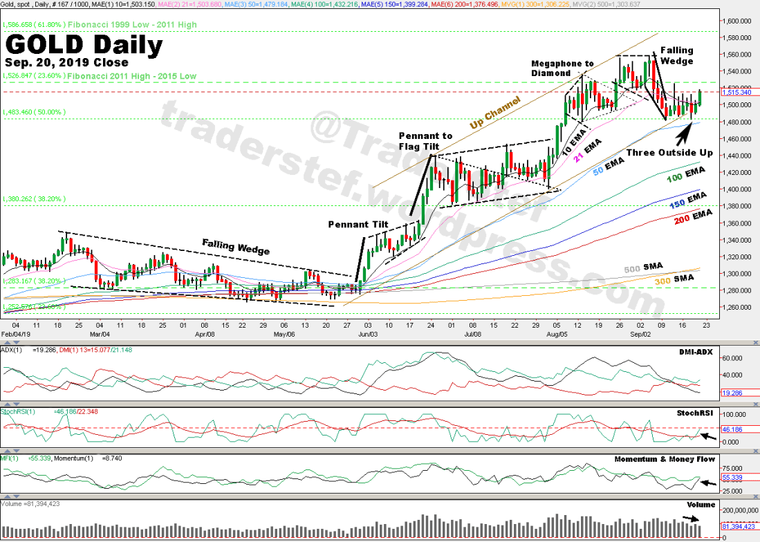 The price action got interesting during the second half of the trading day on Friday after the Fed announced continued REPO operations until Oct.10 and China’s negotiators for the trade war departed the U.S. early. The candlestick setup dominating the chart is a Three Outside Up, which is indicative of a bullish reversal 75% of the time. As noted in the Sep. 7 analysis and subsequent charts posted on my Twitter feed, the Falling Wedge has based out and began to pivot up and away from a confluence of the $1,483 Fibonacci, 50 EMA, and lower trendline of the Up Channel. As of Sep. 20, the price action cleared the 10 and 21 EMA resistance with a $1,515.34 print at the close. The $1,526 Fibonacci must be breached again on volume in order for the price to retest the $1,557.06 high at the peak of the Falling Wedge, which will clear the way for a challenge of the $1,586 Fibonacci level. Volume continues to falter and must pick up the pace in order to challenge the price levels noted. The DMI-ADX remains positive but indecisive, the StochRSI has risen up and out into a positive trend, and the Momentum and Money Flow are back on the rise. I remain bullish long-term, but caution is warranted until the $1,557 level is taken out with conviction.