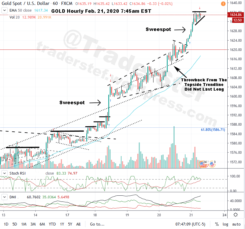 GOLD hourly chart posted on Twitter on Friday Feb. 21, 2020 at 7:45am EST – Gold closed at $1,643 and put in a high of $1,650.