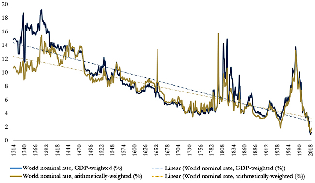 Ever since the 2016 presidential election campaign, the POTUS has suggested the U.S. refinance its extraordinary level of sovereign debt at lower interest rates. Nominal rates in the U.S. debt market recently plunged to record lows of barely above ZIRP, with real rates in NIRP land, as the world plummets into the first wave of a coronavirus (COVID-19) pandemic. The following charts plot the trend of nominal rates from 1300-2018 and the U.S. 10-year note from 1980 to the Mar. 6, 2020 close.