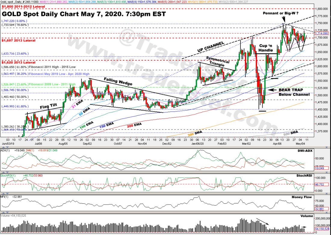 As I publish this analysis, the gold price is $1,720 at 9:30pm and threatening a breakout from the Pennant pattern… Leaving the $1,733 Fibonacci level in the dust is key for the current upward thrust to have any legs. The candlesticks are riding above the 21 EMA and have not broken down to the 50 EMA since the wicked Bear Trap and Cup ‘n Handle in March during the New York vs. London Gold Shortage/Extreme Contango Price Spread. The DMI-ADX is not yet exhibiting an Alligator Tongue power trend to the upside, the StochRSI has just begun to reassert an uptrend, the Money Flow has based out in oversold territory, and the Volume has flat-lined this week. A breakout from the typical spring seasonal pattern does not occur until late May or June, therefore caution is warranted until $1,733 is taken out with conviction and the above-mentioned studies display definitive trends to the upside. Overall, the chart appears to be on the heels of a bullish move towards $1,800.