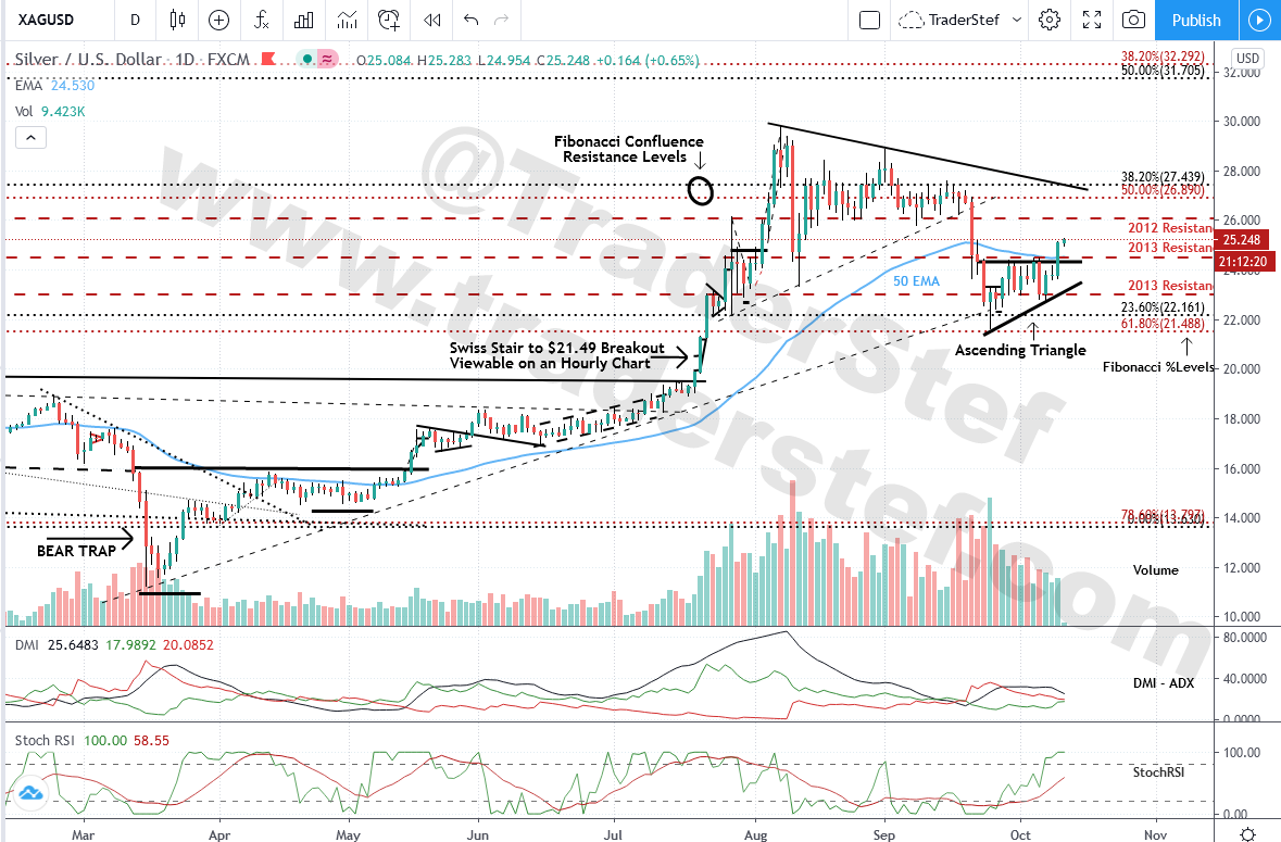 Friday’s RYPO price action decisively breached the Ascending Triangle’s topside trendline, took out the overhead 50 Exponential Moving Average (EMA), began working its way back in between two resistance levels that originate from 2013, and printed a high of $25.15 with a close at $25.08. There is not much resistance on the chart until the next set of Fibonacci levels are revisited and the trendline drawn down from the Aug. 7 high is challenged. The StochRSI is stoked and recent buy volumes are steady, but the DMI-ADX has not yet formed a preferred Alligator Tongue. The silver chart is bullish in the near-term and the long-term trend remains intact.