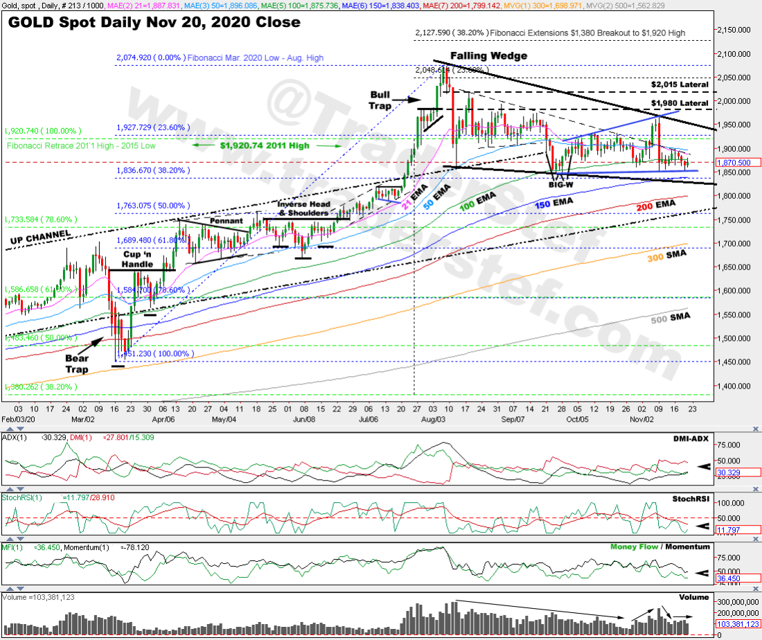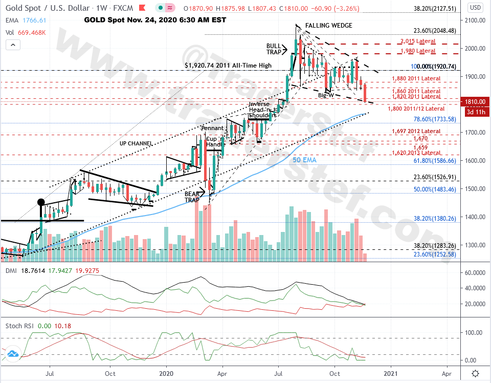 UPDATE NOV. 24, 2020 at 6:30am EST… Gold Weekly Chart… extreme oversold condition with no violation of the 50 EMA, uptrend bull remains intact.