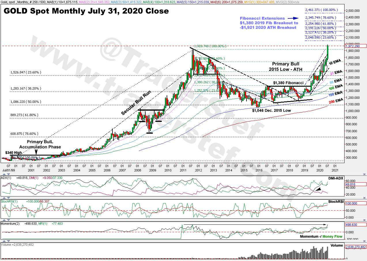 Gold Spot monthly chart as of Jul. 31, 2020 close with Fibonacci Extensions…
