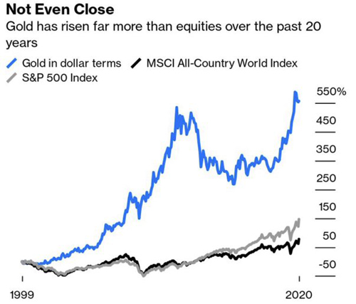 Gold has outperformed stock markets over the last 20 years by gaining roughly 560% vs. 80% against the MSCI All-Country World Index and 146% vs. the S&P 500. A few obvious reasons for gold’s performance vs. equities overall is the extremely loose monetary and fiscal policy implemented by central banks and governments, and a financial situation that is much worse than it was after the Dotcom bubble, 9/11, and the Great Financial Crisis. Subsequent to the world taken hostage in 2020 by the worst pandemic since 1918, any hopium from the Goldilocks mainstream media has mutated into permanent fugazzi.