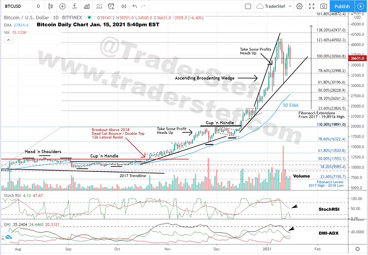 UPDATE: Jan. 21, 2021 – Bitcoin Daily Chart as of Jan. 21, 2021 6pm EST… breakdown away from bearish Ascending Broadening Wedge confirmed.