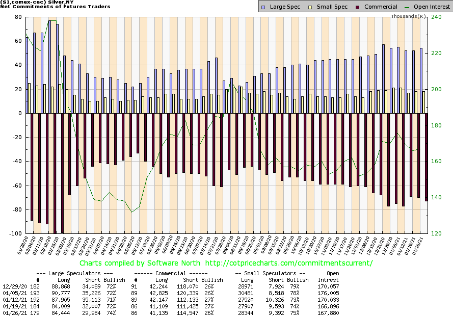 Let’s have a look at silver’s Jan. 23 Commitment of Traders (CoT) report released on Jan. 26, and includes one year of futures contracts represented by bars. The data did not shift significantly (and for two days following the report) before the Reddit crew launched a farcical strategy against a non-existent silver short imbalance.