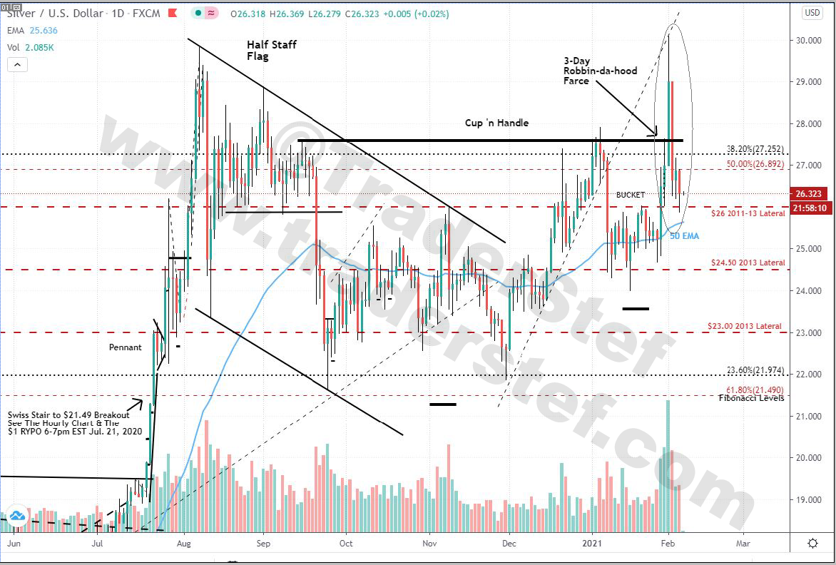The actual sweet spot during silver’s price spike occurred on Jan. 31 after the Sunday night open, and within a brief window of opportunity in Asia to Europe during the overnight hours in the U.S. The price punched through the Cup ‘n Handle’s $27 rim line and onto $30 during the early morning hours in London. The price had already plunged before Monday’s EST stateside pre-market open, then chopped violently all day at $28 and change. During pre-market on Tuesday, the price action had already broken below $27.
