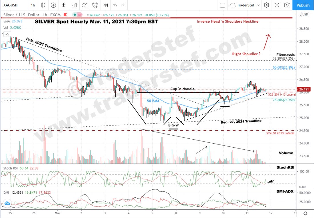 The silver price tumbled in lockstep with gold since the end of February. On the bright side, it printed a third higher low since Sep. 2020, which was $25.10 on Mar. 5, whereas gold printed a lower low since its Aug. 2020 high. After pivoting on the hourly chart, silver took out the overhead 50 EMA, then formed a Big W pattern with a brief Throwback to the 50 EMA, and that formed a Cup ‘n Handle with a rim line at $26. The price printed a high of $26.44 this morning, and is retesting support this evening at the confluence of $26 and the lower trendline drawn up from the Big W low.