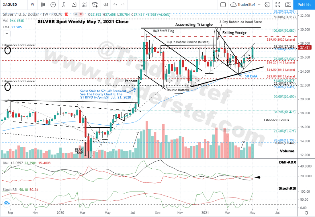 Silver Spot weekly chart as of May 7, 2021 5pm EDT close…