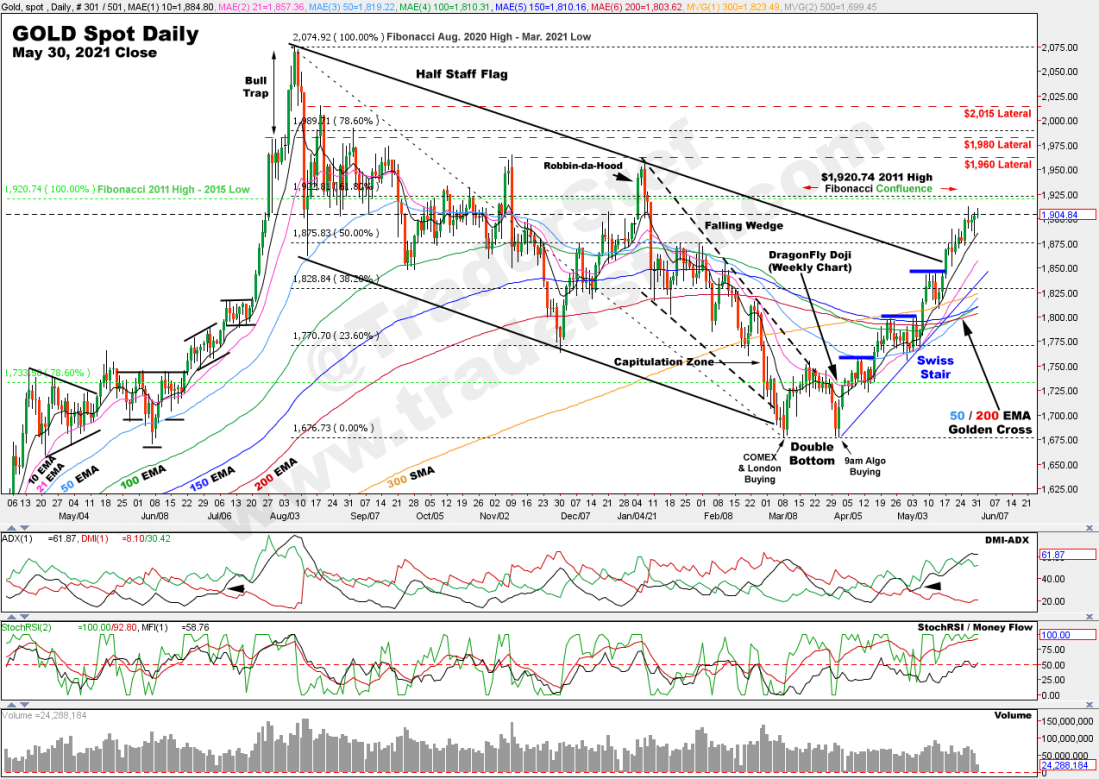 The price action is bullish, but it does appear that a healthy breather is in order near the $1,920 lateral and Fibonacci Confluence. The Alligator Tongue power trend set up on the DMI-ADX is slightly long in the tooth along with the StochRSI, which is another indication that a healthy breather may be in order before challenging $1,960, the more important $1,980, and finally $2,015. There is not much more to say because all the stars are lining up for a hot summer. The gold chart is very bullish.