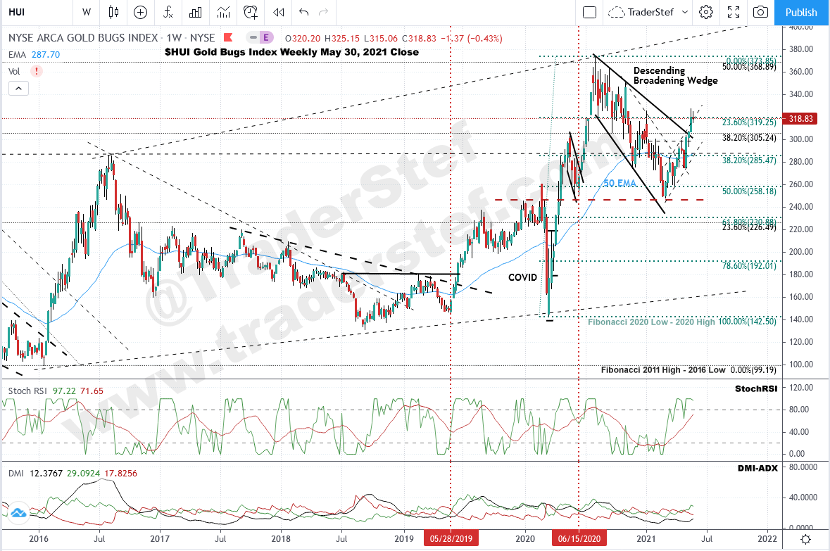 $HUI Gold Bugs Index weekly chart as of May 30, 2021 close…