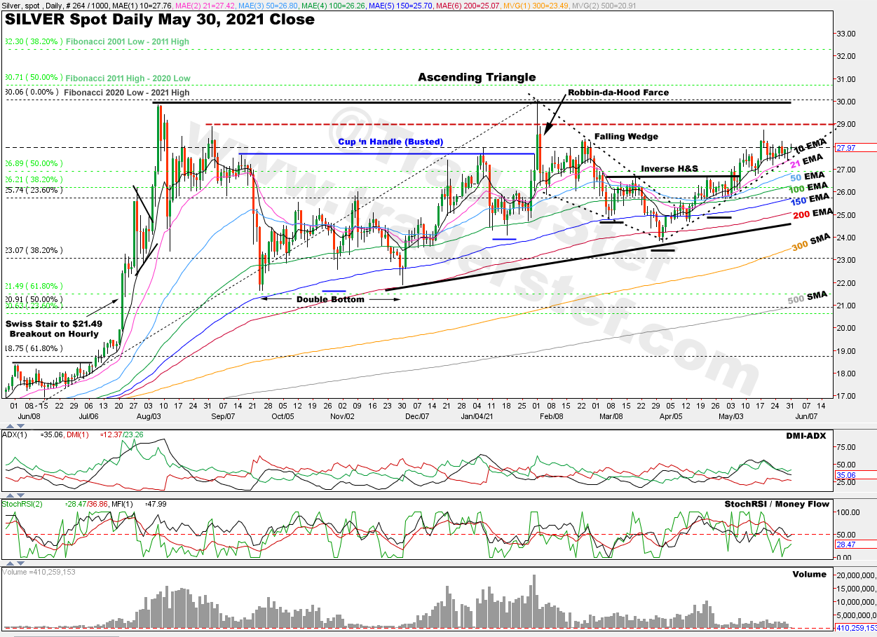 “After breaking away from the Falling Wedge, the price has printed higher lows within a steady Up Channel. The price closed at $27.43 this week and is sitting on the topside set of Fibonacci confluences. The dominant pattern that is forming is a bullish Ascending Triangle with its topside trendline at $30. The StochRSI is steadily making upward progress, the DMI-ADX is closer than gold’s to forming an Alligator Tongue power trend setup, and buy Volume is rising along with a rising price. The price action is edging closer to the all-important $29 to $30 resistance zone. If the $29-$30 level is taken out decisively on price and Volume, a bull run to $50 could be explosive. Stay on your toes.”