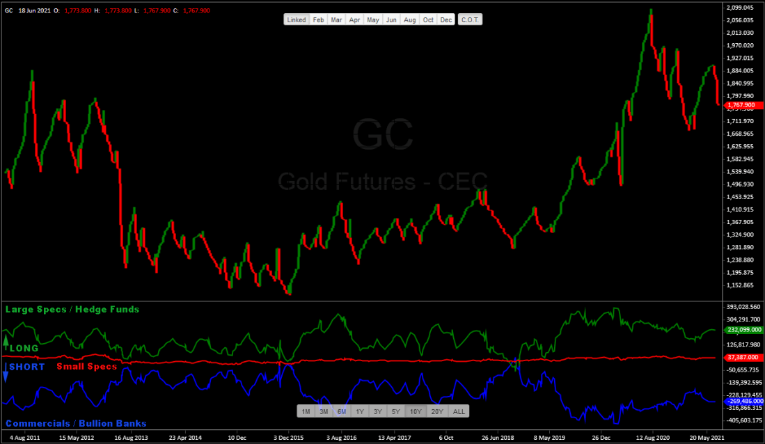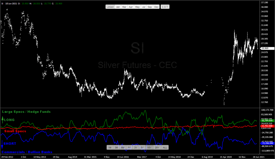 Here are the gold and silver futures overlayed with the Commitments of Traders (CoT) report for the last decade as of Jun. 18, 2021. Note there is no significant shift in the net long vs. net short positions prior to Wednesday’s FOMC meeting. The charts are courtesy of Timing Charts and my annotations.