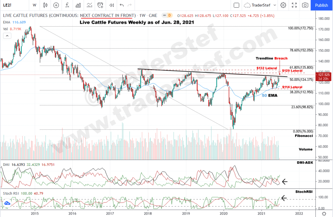 Live Cattle looks slightly different with overhead resistance along a downward trendline drawn back to the 2017 high. The DMI-ADX Alligator Tongue is in better shape than the Feeders, the StochRSI is indicative a potential rally in the near future, and the price is trending above the 50 EMA. Today’s price action breached that topside trendline without conviction and take note of the three overhead lateral bus stops at $129, $132, and the 61.8% Fibonacci at $136. There is no significant resistance until $152 if $136 is taken out with conviction on price and Volume.