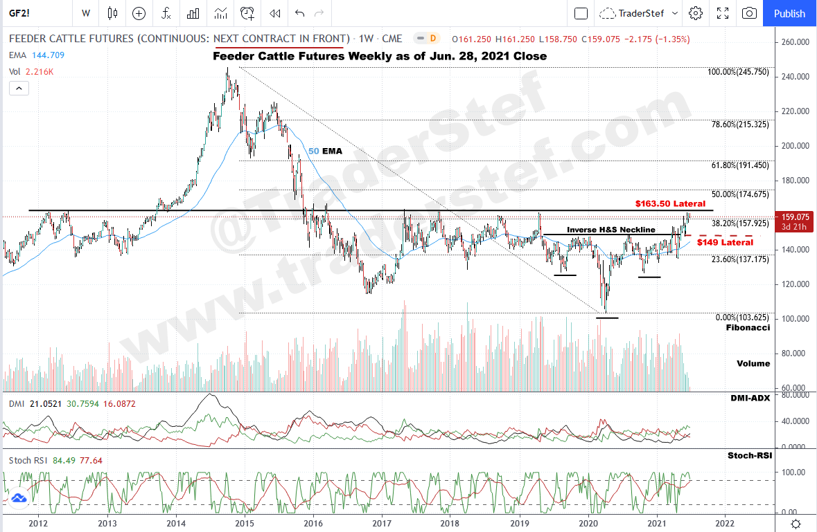 What stands out on COW and the Futures charts that follow is the current price action sitting just below a significant lateral resistance. On COW, that resistance is between $40 and $40.50 which includes the Fibonacci 50% level and a lateral drawn back to the 2020 low. The first level of support rests at $35. The DMI-ADX is unremarkable, the StochRSI is oversold, and the price action has been trending above the 50 Exponential Moving Average (EMA) after $35 was taken out in Jan. 2021. The price action will likely remain choppy until the Futures breach or fail their respective resistance levels.