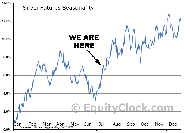 Gold and Silver Futures 20-year seasonality range/location as of today…