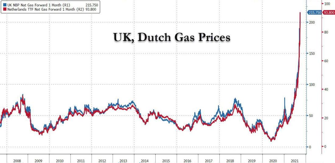 Europe’s Gas And Power Prices Hit New Records… “The gas price at the Dutch TTF hub, the benchmark gas price for Europe, soared by 13.4 percent to 98.23 euros per MWh on Thursday, while the price at the UK National Balancing Point (NBP) virtual trading point reached another record high, jumping by 17.4 percent to 252.53 pence/term… Coal prices are also surging amid a tight global market supply with Chinese demand booming and with high EU carbon prices.” – OilPrice.com, Sep. 30